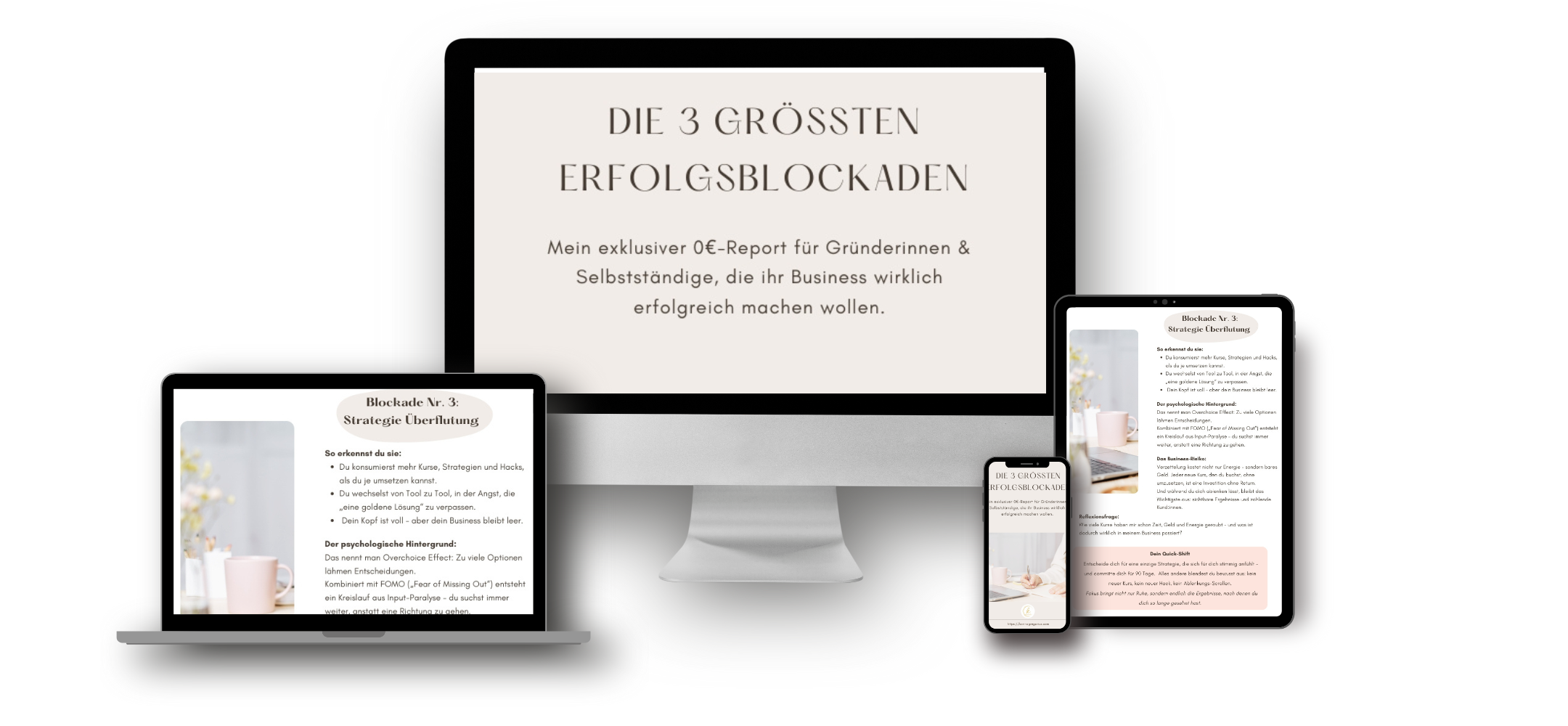 Die 3 größten Erfolgsblockaden und wie du sie durchbrichst. Mein exklusiver Report für Gründerinnen & Selbstständige, die innere Klarheit suchen und ihr Business in Bewegung bringen möchten.